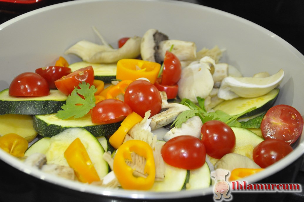 - Seramik tabanlı tenceremize sırasıyla halka patates + halka kabak + mantar + cherry domatesleri +biberleri + damla sakızı + karabiber +sarımsak + tuz ‘unu ekleyin.