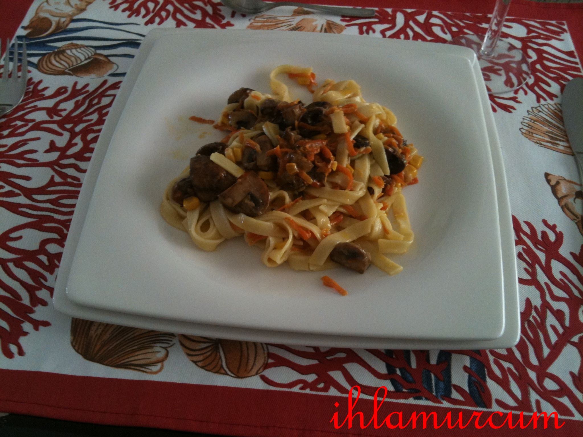 Taze naneli mevsim salatası eşliğinde yenen mantarlı tagliatelle makarna…