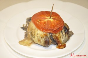 5-)  Çukur bir çorba kasesi alıp, resimdeki gibi 3 dilim patlıcandan bir kase yapın.  İçine  kaşıkla mantarlı etten koyun.  Patlıcanların uçlarından kapatıp, Üzerine 1 dilim domates kapatın.  Bir bohça yapın.